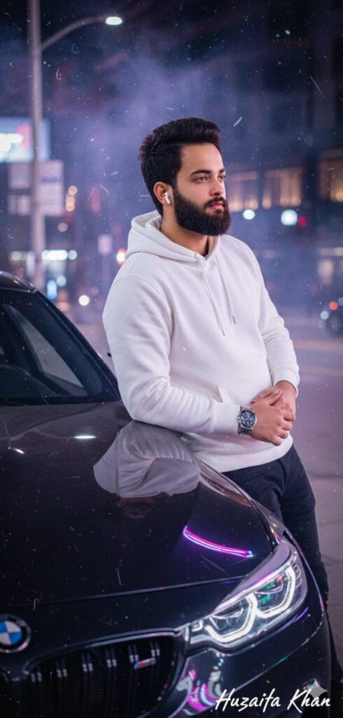 A close-up cinematic 8K photo of the man leaning on a black BMW, neon lights reflecting on the hood. Camera from a low angle, showing him looking away to the side, with smoke and dust around. He wears a white hoodie with a silver watch, the scene lit by purple and blue streetlights. Mood: high-tempo music video, attitude + motion.