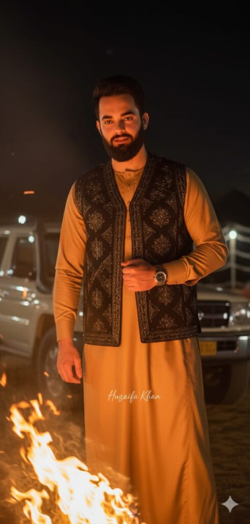 A highly detailed 8K cinematic portrait, half-body shot, taken at night near a traditional desert bonfire. The man wears a caramel-colored thobe and black embroidered vest, with a silver watch resting slightly lower on his face. Firelight reflects warmly on his skin and the metal embroidery threads. Background: faint glow from a Land Cruiser and desert tent lights.