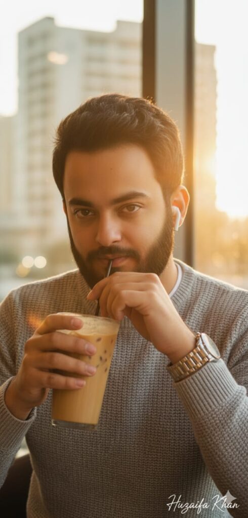 A cinematic 8K ultra-detailed close-up portrait taken by the window of a luxury café in City. The man wears a light gray sweater with a white undershirt and a watch with a metallic reflection. He’s holding his iced coffee near his lips, eyes slightly turned toward the camera.