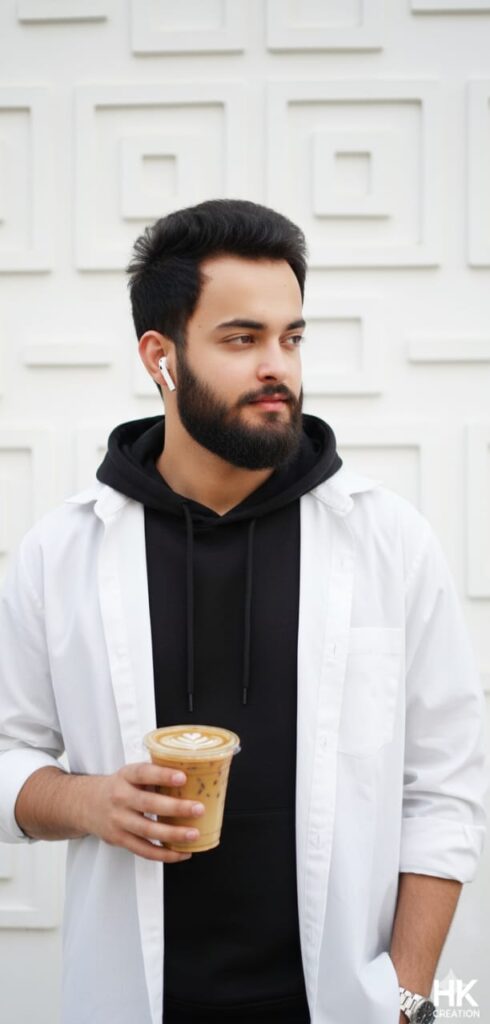Edit this photo to show a handsome young man wearing a black hoodie and a white oversized button-up shirt worn open. He holds a plastic cup of iced coffee with a latte art leaf design and gazes thoughtfully to the side. He wears a wristwatch. The background features a modern white wall with a geometric, square-patterned design.