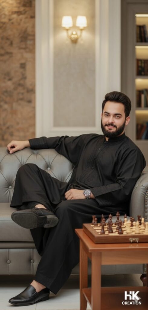 Create an 8k ultra-realistic DSLR portrait of a 23-year-old boy, replace my outfit with an oversized black Balochi traditional outfit, wearing black shoes, and a branded silver watch. I’m lying backward on a Gray leather comfortable sofa inside a luxury room. On the side table, there is chess. Keep my face 100% same as in the reference image.