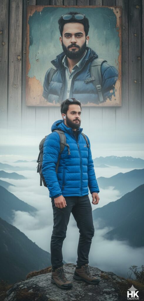 Ultra-realistic, high-fashion editorial portrait of a stylish young man with the exact attached face, emanating quiet strength. He stands confidently on a misty mountain peak in the Himalayas, overlooking a breathtaking valley. He’s dressed in a puffer jacket in a vibrant sapphire blue, sleek technical trousers, and robust, branded hiking boots. adds an adventurous edge. Soft, diffused light filters through the clouds, creating a majestic, ethereal glow. Behind him, a massive, faded painting on a rustic wooden lodge wall portrays the same man as a contemplative wanderer, adding a touch of philosophical depth.