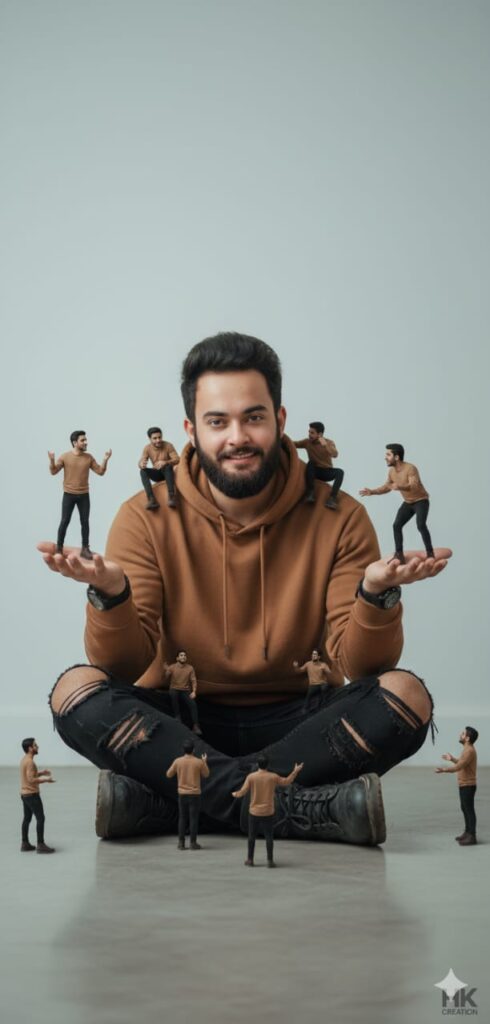 Creative surreal portrait of a man sitting on the floor wearing a brown hoodie, ripped black pants, and boots, surrounded by several miniature versions of himself. Several smaller versions stand on his hands, shoulders, and around him on the floor, interacting playfully with the larger versions. The light gray background is minimalist, clean, and simple. The lighting is soft and cinematic, with realistic shadows and depth of field