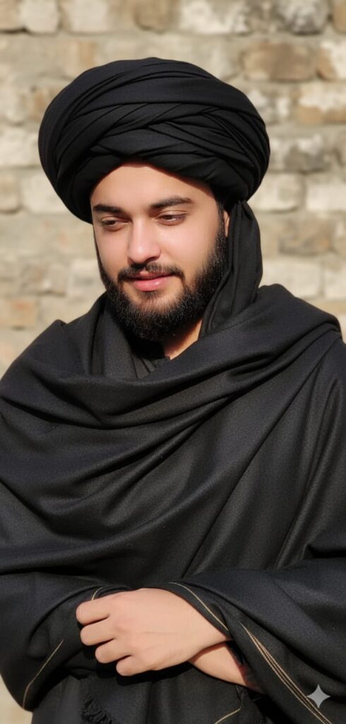 Outfit: traditional Afghani-style matte black wrap and turban, with soft natural folds and a light texture visible under daylight.