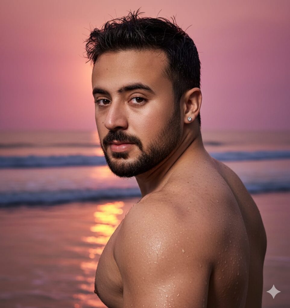 The subject is topless, the muscular body glistening with water droplets, suggesting just having finished swimming. Add a men’s diamond earring for a refined touch. Include a sun setting at the horizon, soft golden reflections on the ocean, and gentle waves in the background.