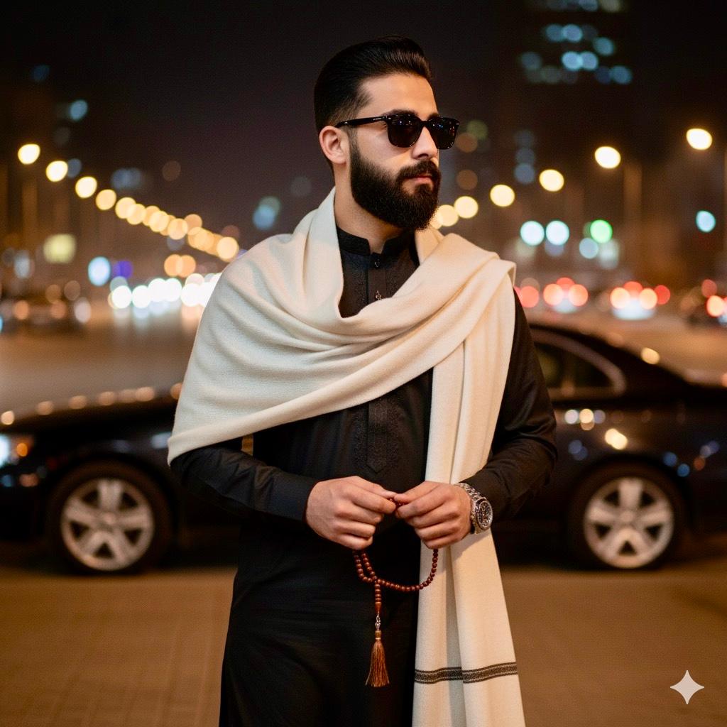 A full-length portrait of a handsome young man standing outdoors at night, with a blurred background of city lights and a dark vehicle. He is fair-skinned, with a neatly trimmed beard and dark hair styled with a slight pompadour. He is wearing stylish sunglasses and a black traditional South Asian outfit, possibly a “shalwar kameez” or “kurta.” A light-colored, possibly off-white or cream, shawl is draped over his left shoulder and wrapped around his torso. He holds a string of prayer beads, “tasbih” or “misbaha,” in his hands. He is looking off to the side with a serious expression.